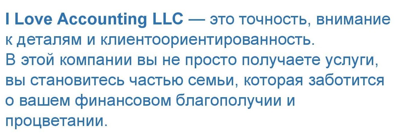 — Если вы открыли бизнес, лучше сразу найдите бухгалтера, который будет мониторить финансовые потоки вашей компании, показывать картину бизнеса изнутри, поможет лучше видеть и планировать деятельность, убережет от ошибок и проинформирует об изменениях в правилах и законах. I Love Accounting LLC оказывает все виды бухгалтерских услуг — от подготовки и подачи налоговых деклараций до бухгалтерского сопровождения и расчета зарплат. Будем рады видеть всех в числе наших клиентов!