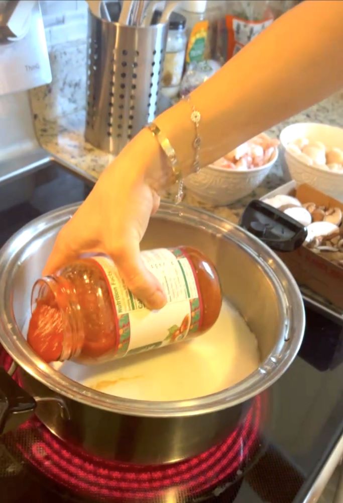 - В небольшой кастрюле на большом огне довести до кипения кокосовое молоко и влить в него томатный соус.
