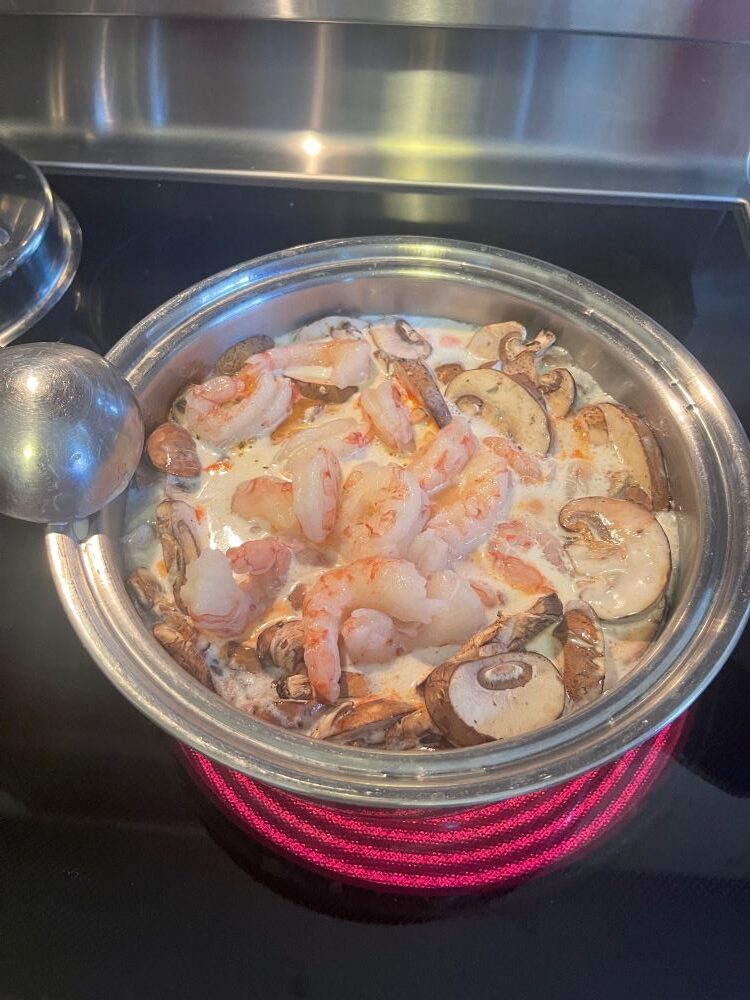 - Добавить грибы, гребешки и креветки (если замороженные, предварительно разморозить) и варить на медленном огне, пока суп не закипит.