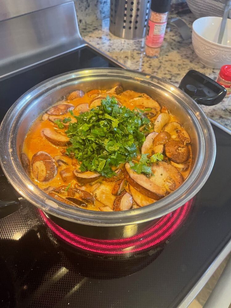 - Выключить кастрюлю и добавить 3–4 капли душистого эфирного масла Thai Doterra и нарезанную кинзу.
