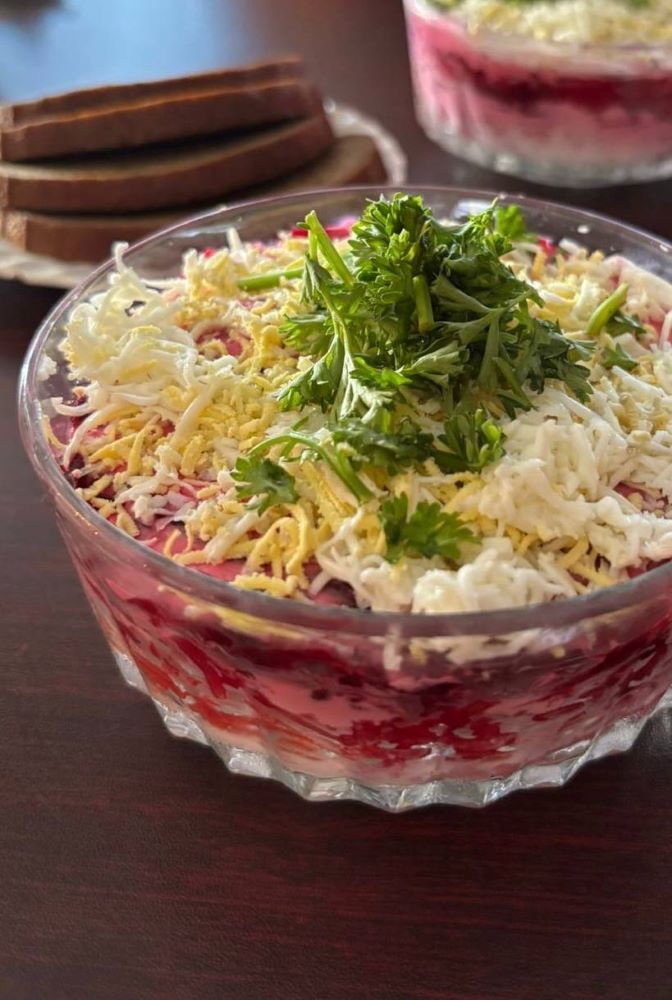 5. Выбираем посуду для салата, прозрачную, если есть, и начинаем выкладывать все слоями: выложить половину картофеля, сверху промазать его майонезом; далее — половину моркови, промазать майонезом; половину свеклы, промазать майонезом; всю селедку с луком и дальше выкладывать слои из овощей в таком же порядке.