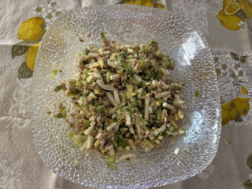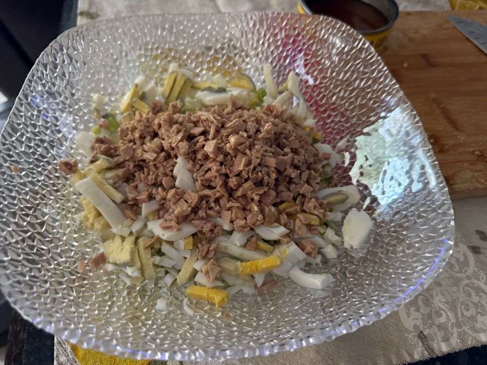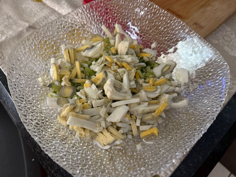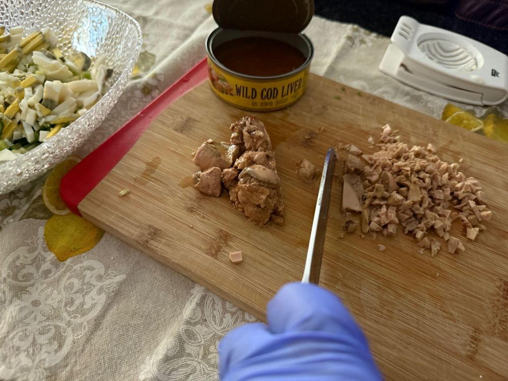 - Отваренные вкрутую и охлажденные яйца порубить ножом или воспользоваться яйцерезкой. Переложить в миску.4. Достать печень трески из банки, нарезать небольшим кубиком, добавить к остальным ингредиентам.5. Посолить, поперчить по вкусу. Опять же по вкусу добавить сок из банки от печени трески, все перемешать. Салат готов!