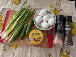 - Тонко нарезать зеленый лук и отправить в глубокую миску.2. Мелким кубиком нарезать небольшие свежие огурцы и отправить туда же.
