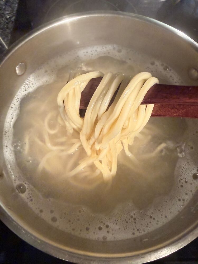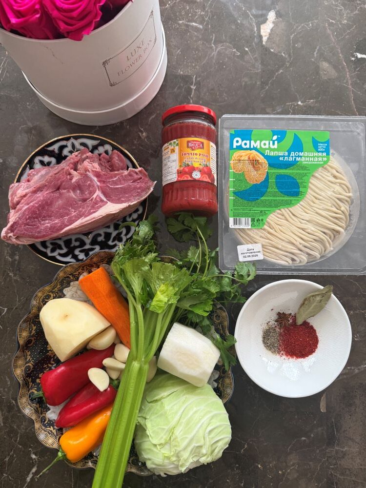 - Отварить толстую лапшу, купленную в русском или азиатском магазине.7. Когда бульон-подлива будет готов, можно собирать лагман. В глубокую чашу положить лапшу, сверху залить жидкой подливой и украсить зеленью.