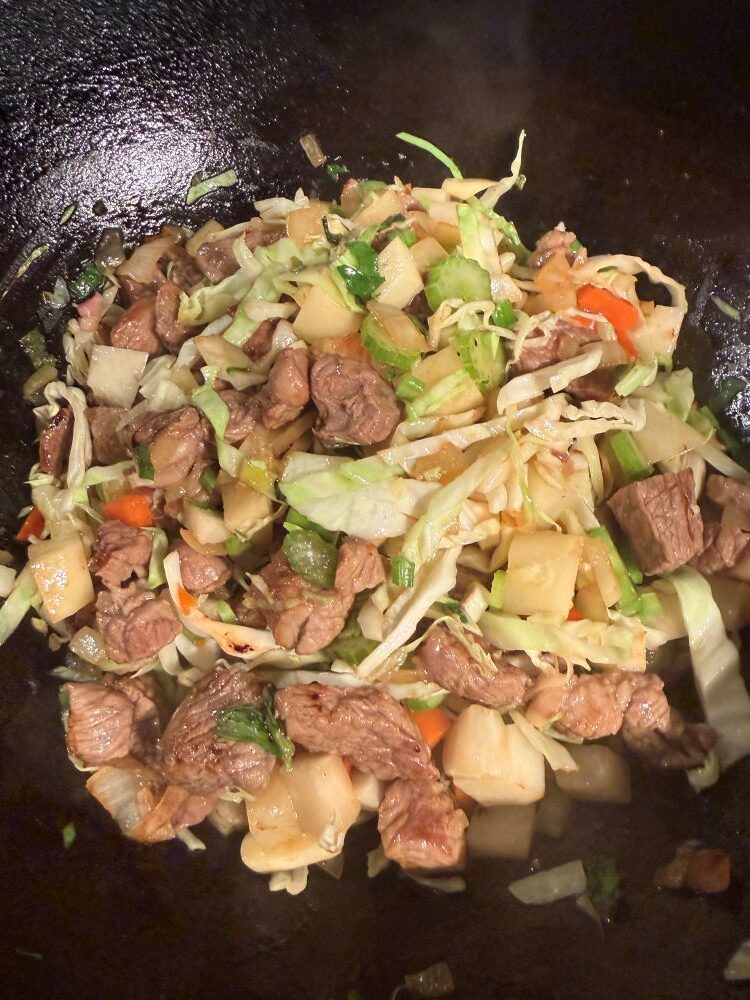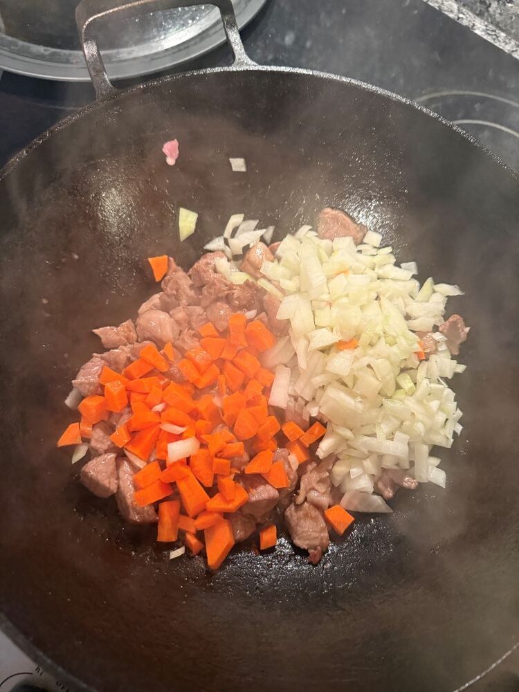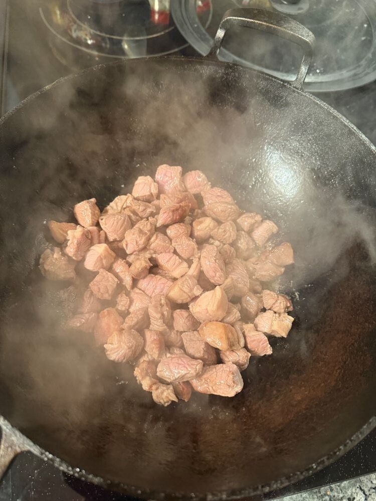 - Порезать все ингредиенты кубиками. Мясо прожарить на растительном горячем масле.