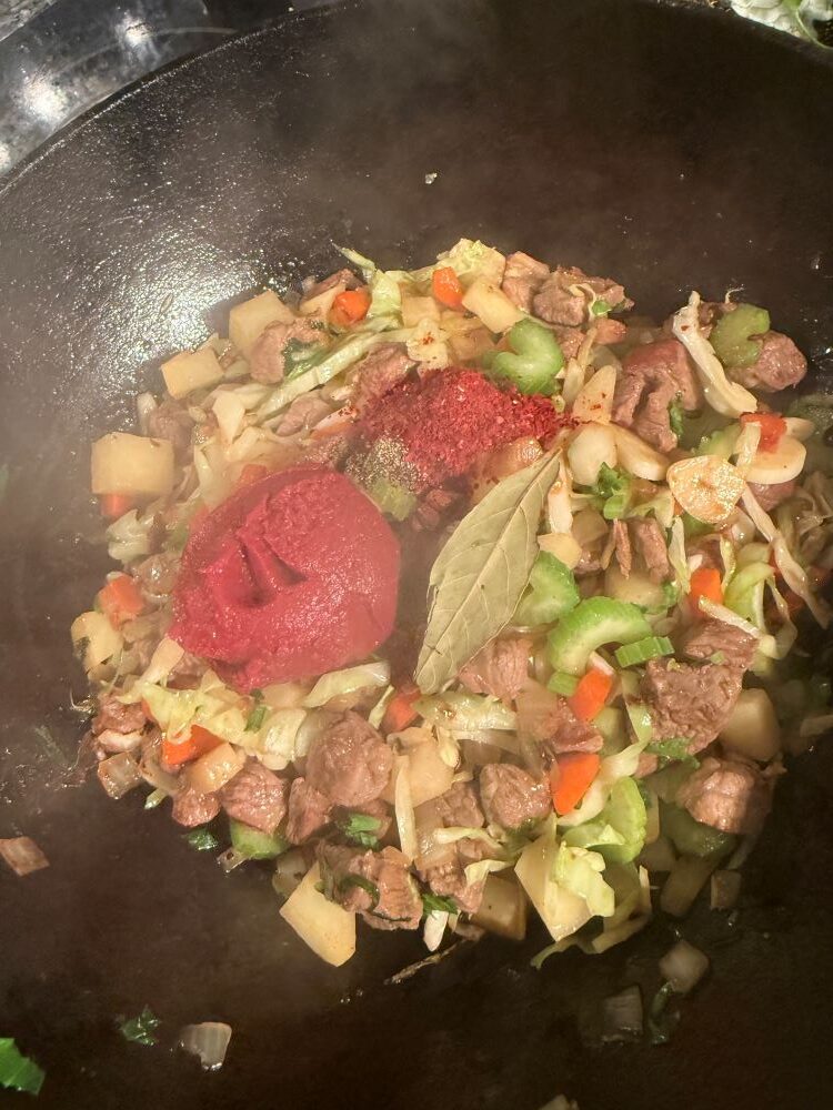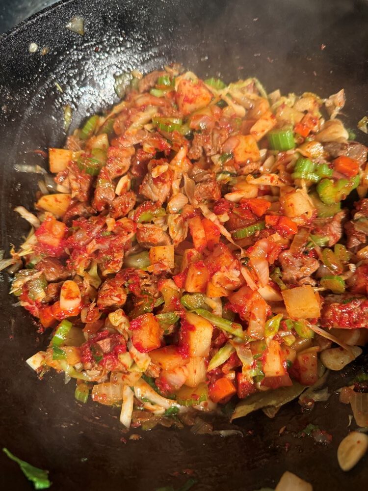 - Все хорошо прожарить и добавить томатную пасту.